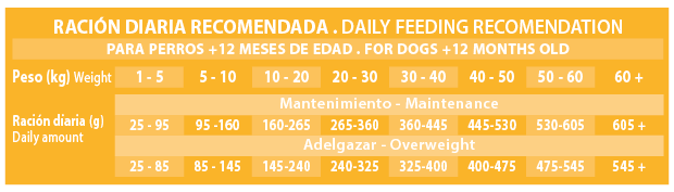 Composición: Carne deshidratada* (20%), Maíz, Trigo*, Salvado de trigo*, Cebada*, Carne de pollo deshidratada* (6%), Pulpa de remolacha*, Algarroba*, Arroz* (4%), Levadura de cerveza*, Pollo hidrolizado*, Grasa animal*, Minerales, Aceite de salmón*, Algas marinas* (0,5%), Prebiótico MOS*, Yuca de mojave*.
